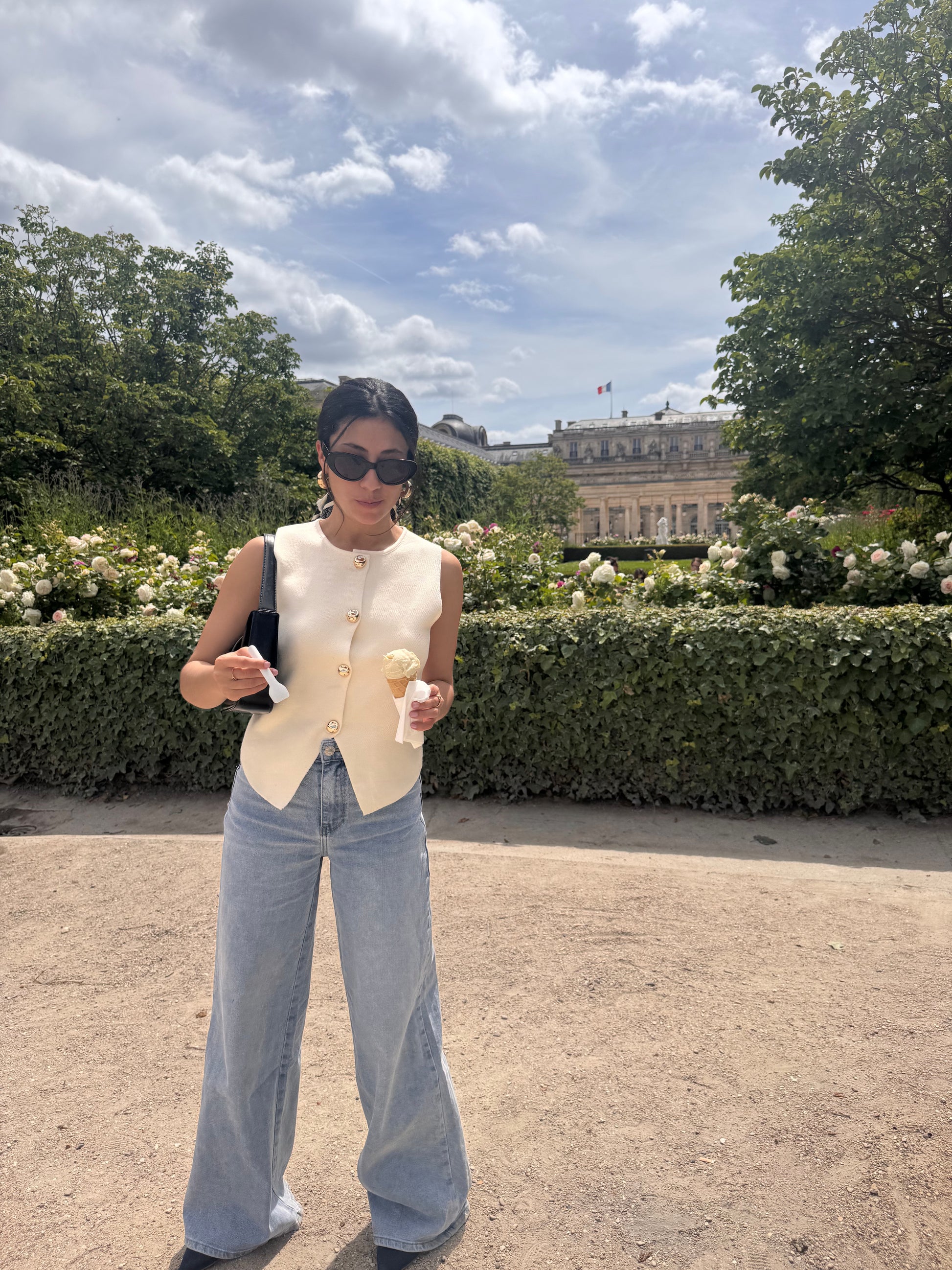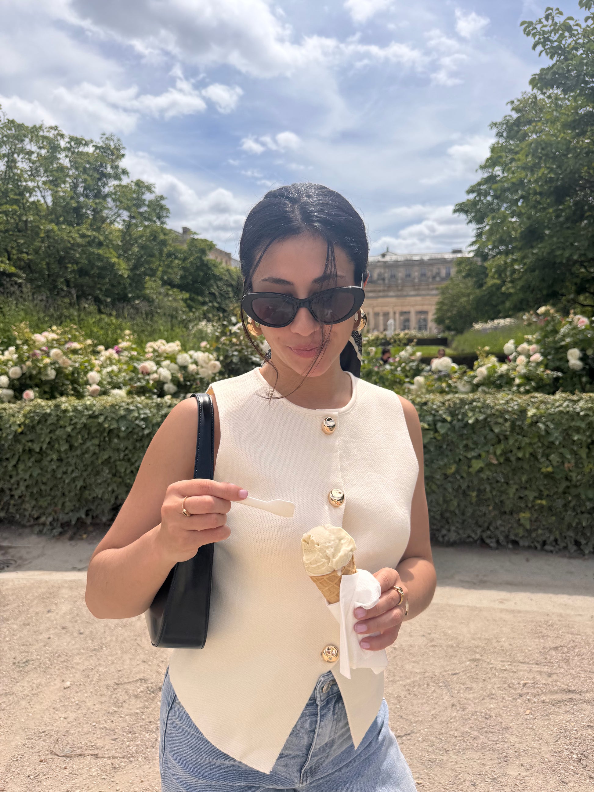 Encolure en V. Coupe droite. Boutons apparents doré pour une touche élégante. Finitions côtelées.
