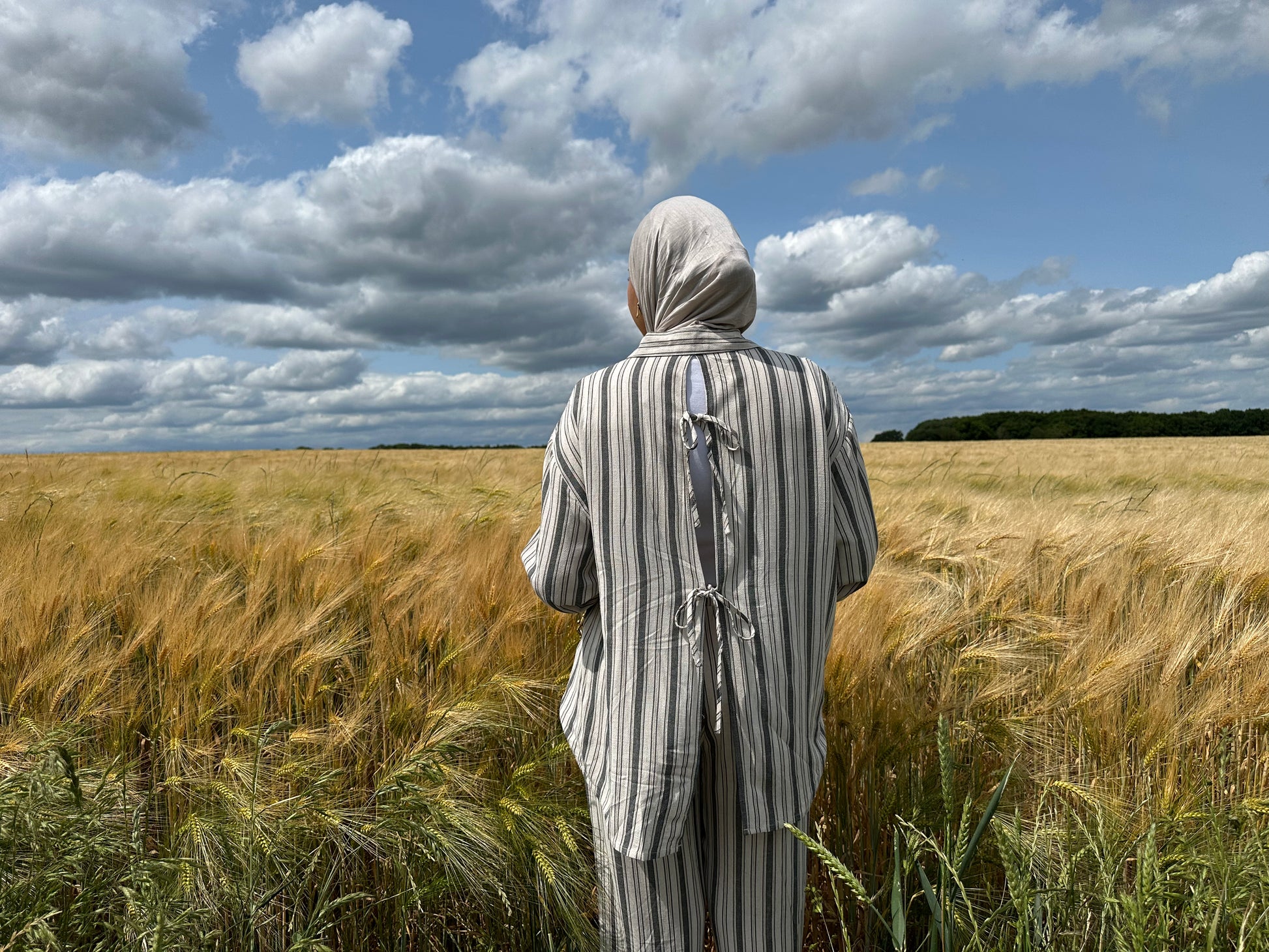 Motif rayé discret. Coupe ample et fluide pour un confort optimal. Liens noués dans le dos pour une touche féminine. Tissu léger et agréable à porter.