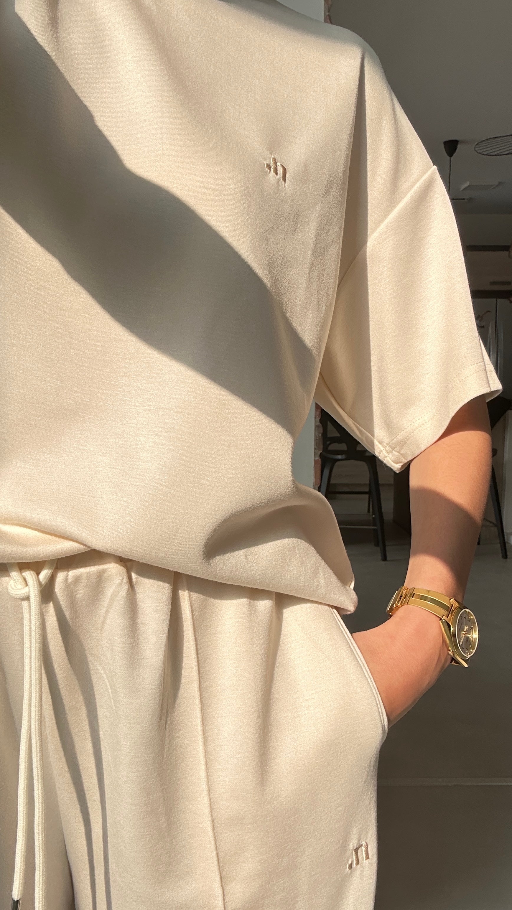 T-Shirt coupe oversize à col rond. Pantalon large avec taille élastique et lien de serrage. Détail logo brodé. Tissu fluide, confortable et élégant. L'équilibre parfait entre détente et allure minimaliste.